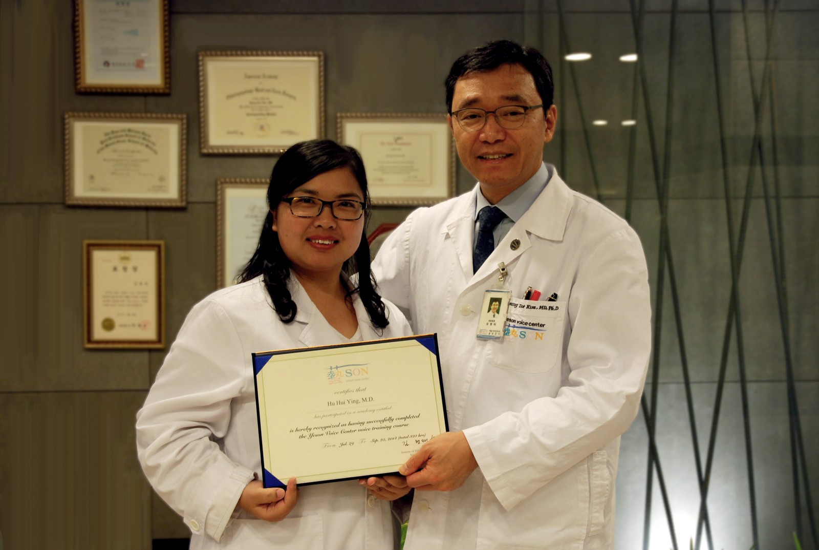 중국, 난징동인병원 소속 의사 Hu Huiying(이하, Dr. Hu)는 중국 현지에 난징동인예송음성센터를 창립하기 위해 예송이비인후과 음성센터(이하, 예송음성센터)에서 지난 7월부터 2개월간 파견연수를 받았습니다. 연수기간 동안 성대질환 환자뿐만 아니라 음성전문사용환자(가수, 뮤지컬배우, 아나운서, 쇼호스트, 교사 등)의 목소리 상태를 객관적이면서 전문적으로 측정할 수 있는 발성 역학적 다차원 측정 검사를 비롯한 성대종합검진의 평가, 분석과 환자 별 질환에 따른 음성관리·재활프로그램법 습득 및 수술참관을 하였습니다. Dr. Hu는 “중국에서는 이렇게 세부적이고 전문적으로 성대를 면밀히 측정하고 관리하는 의료시스템이나, 수술 시 PDL(Pulsed dye laser)를 이용해 성대 혈관만을 선택적으로 응고시켜 병변만을 선택적으로 파괴해 재발 방지할 수 있는 의료기술에 놀라웠다. 세계적인 목소리 전문병원인 예송이비인후과 음성센터의 첨단 시스템과 언어치료, 의료연수를 받을 수 있는 뜻 깊은 시간이었다.” 며, “중국 난징(南京)에 ‘난징동인예송음성센터’ 합작병원의 일원으로 최선을 다하겠다.”고 전했습니다.
