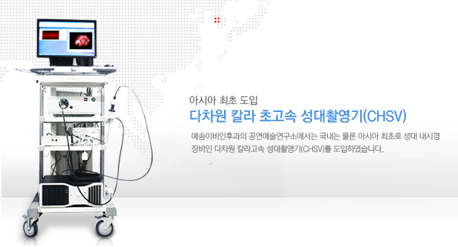예송이비인후과의 공연예술연구소에서는 국내는 물론 아시아 최초로 성대 내시경 장비인 ‘다차원 칼라고속 성대촬영기(CHSV)'를 도입하였습니다. ‘다차원 칼라고속 성대촬영기’는 기존의 흑백으로 촬영 가능한 초고속 성대 촬영기(HSV)와 비교하여 성대의 상세한 칼라 이미지를 제공해줄 뿐만 아니라 초고속 촬영기법(최대 초당 5000프래임)으로 성대진동을 촬영하여 실제 성대 진동양상과 점막파동에 근접한 동영상을 제공해줄 수 있습니다. 초고속 성대 촬영기(HSV)와 후두 스트로브스코피(Rhino-Laryngeal stroboscopy)의 장점을 결합한 ‘다차원 칼라고속 성대촬영기(CHSV)’를 도입함으로써 성대의 기질적 장애군 뿐만 아니라 기능적 장애군에 대한 더욱 확실한 진단이 가능하게 되었습니다.